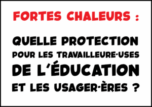 - Fortes chaleurs : quelle protection pour les travailleur·euses de l’Éducation et les usager·ères ?Les fortes chaleurs, de plus en plus régulières et intenses, affectent les conditions de travail et d’étude et peuvent mettre en danger la santé des personnels comme des élèves. Alors que le bâti scolaire est largement inadapté pour s’en prémunir, que faire pour nous protéger ? Au niveau des personnels, faute de dispositions réglementaires spécifiques, nous relevons des dispositions générales du… Lire la suite : Fortes chaleurs : quelle protection pour les travailleur·euses de l’Éducation et les usager·ères ?