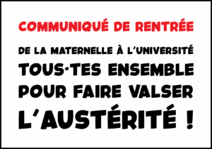- De la maternelle à l’université : tous·tes ensemble pour faire valser l’austérité !Après 2025, le gouvernement a préparé une deuxième année d’austérité avec un plan d’économie de près de 45 milliards pour 2026 et de multiples annonces contre nos droits. Au même titre que l’ensemble des travailleur·euses, nous serions encore largement impacté·es par ce projet : – augmentation du temps de travail : suppression de deux jours fériés ; – année blanche… Lire la suite : De la maternelle à l’université : tous·tes ensemble pour faire valser l’austérité !