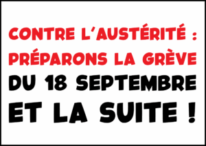 - Contre l’austérité : préparons la grève du 18 septembre et la suite !La journée de mobilisation du 10 septembre a été un large succès : plusieurs centaines de milliers de manifestant·es sur tout le territoire, des actions dans les petites, moyennes et grandes villes, des piquets de grève, des débrayages… Continuons de pousser et de mettre la pression, l’étape suivante c’est la construction d’un mouvement de grève qui doit se généraliser pour… Lire la suite : Contre l’austérité : préparons la grève du 18 septembre et la suite !