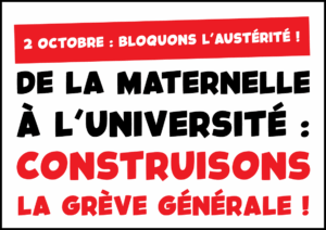 - 2 octobre : bloquons l’austérité ! De la maternelle à l’université : construisons la grève générale !Sans surprise, Lecornu n’avait rien à dire aux syndicats institutionnels reçus à Matignon le mercredi 24/09. Avec des accords politiciens, il compte maintenir l’essentiel des mesures d’austérité et des reculs sur nos droits dans le budget 2026 (il vient d’évoquer « une diminution de 6 milliards d’euros sur l’Etat et son train de vie ») ! Pour obtenir une vraie… Lire la suite : 2 octobre : bloquons l’austérité ! De la maternelle à l’université : construisons la grève générale !