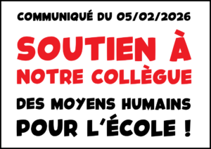 - Soutien à notre collègue – Des moyens pour l’Ecole !Jeudi 05/02/2026 Mardi 3 février, une enseignante a été victime d’une attaque au couteau sur son lieu de travail, poignardée à plusieurs reprises, elle est dans un état grave. Nous exprimons tout notre soutien à cette enseignante, sa famille, ses proches ainsi qu’aux élèves qui ont assisté à la scène, au personnel de l’établissement. Cette attaque au couteau d’une extrême violence… Lire la suite : Soutien à notre collègue – Des moyens pour l’Ecole !